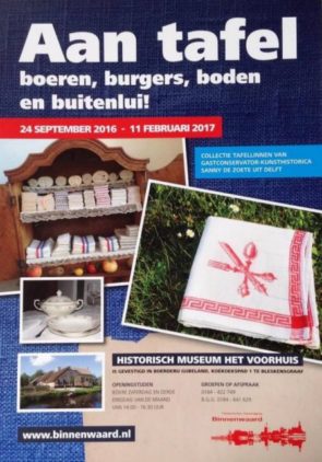 Tot en met 11 februari 2017 staat Museum Het Voorhuis in Bleskensgraaf in het teken van de tafelcultuur van de boeren, burgers, boden en buitenlui van Nederland. Deze tentoonstelling is tot stand gekomen door samenwerking met gastconservator-kunsthistorica Sanny de Zoete uit Delft. Haar collectie tafellinnen is het uitgangspunt. In dit kleine plattelandsmuseum aan het Koekoekspad in Bleskensgraaf ligt meer linnengoed dan in de grote Nederlandse musea bij elkaar.