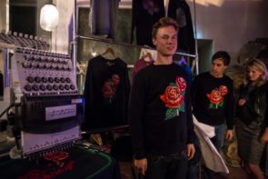 Project 'Blijvend Borduren'. Thijs van Buuren van Tegendraads met een borduurmachine