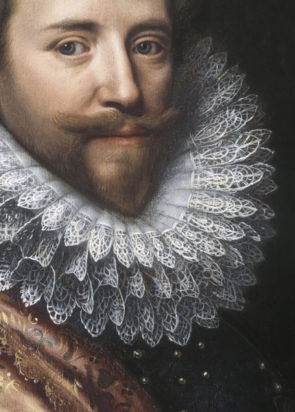De haute couture van Viktor & Rolf vormt een samenspel met het schitterende harnas en de weelderige kraag op het portret van Frederik Hendrik, Prins van Oranje geschilderd door Michiel van Mierevelt.