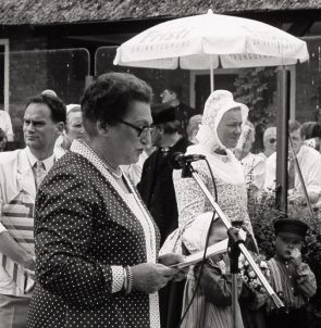 Eef Bosch-van de Kolk tijdens de opening van een streekdrachttentoonstelling in het Nederlands Openluchtmuseum