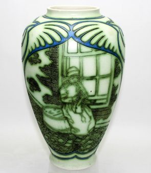 Vaas met breiend meisje, sgraffitotechniek, De Distel, ca. 1916. Coll C.J. Baas / Keramisch Museum Goedewaagen, Nieuw Buinen